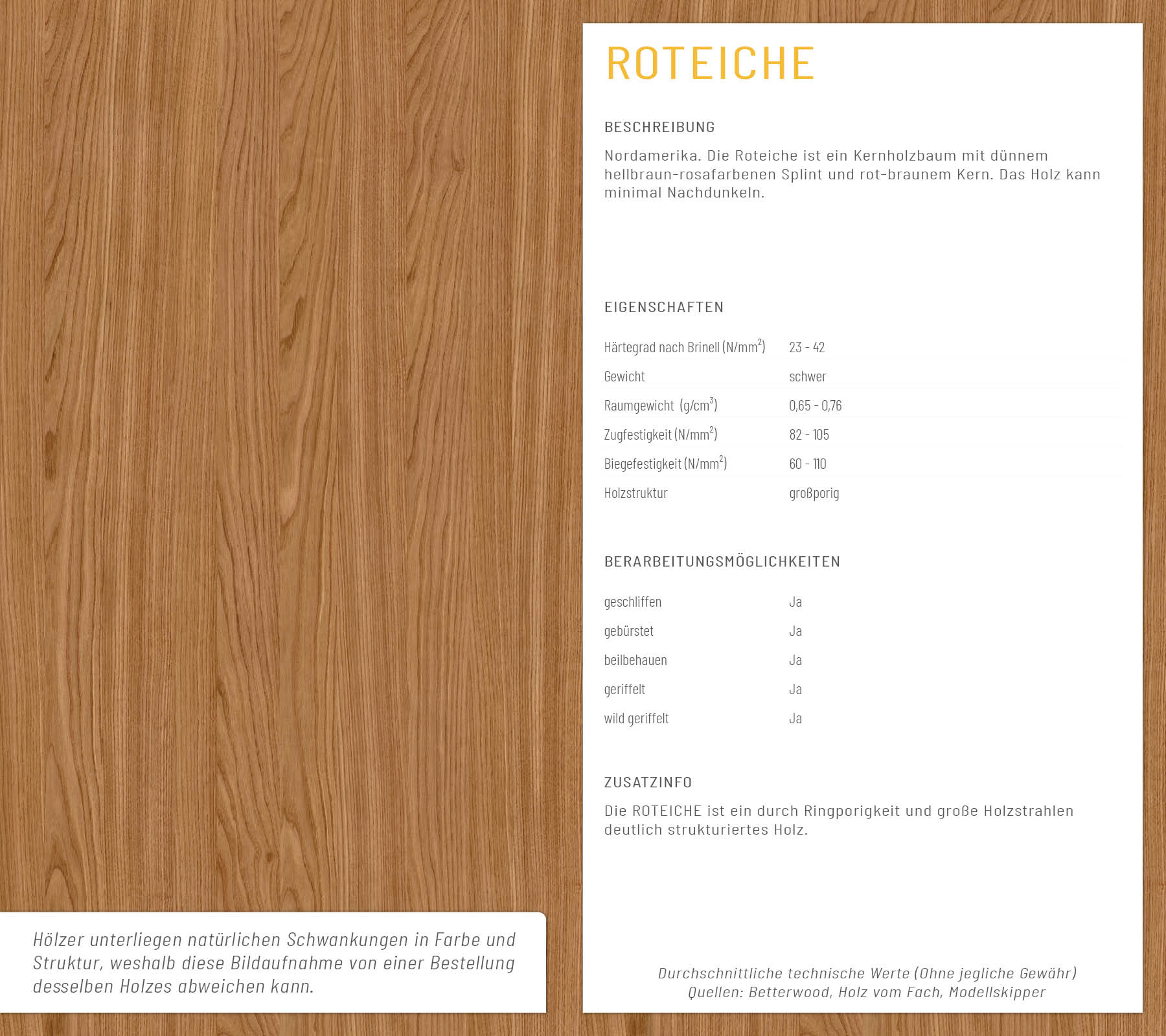 Die Maserung, Struktur und Farbnuance sind anmutig und einmalig, sie unterscheiden sich von einem zum anderen. Diese wechselnden Merkmale machen den Naturwerkstoff Holz erst aus, sie haben ihren Ursprung im Wuchs des Baumes.