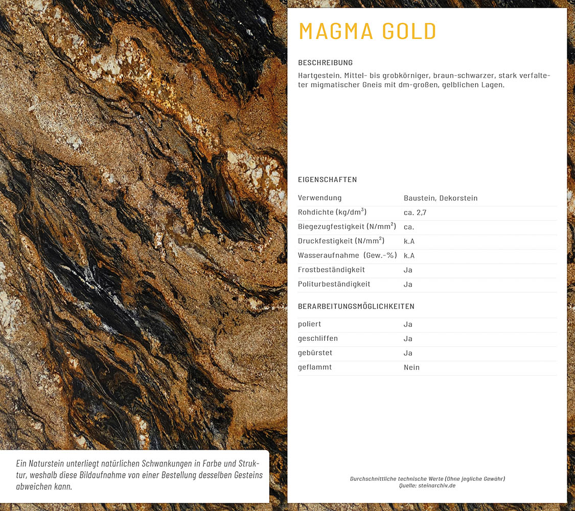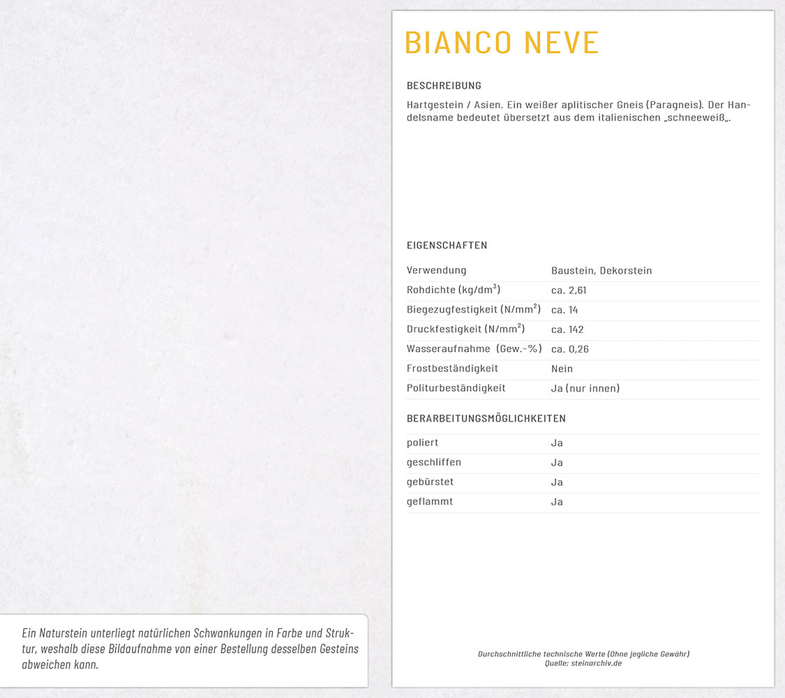 Naturstein ist ein Naturprodukt. Abweichungen in Farbe und Gefüge, Flecken, Adern, offenen Stellen, Einsprengungen, Schattierungen usw. sind keine Materialfehler sondern Naturgebilde. Fehlstellen werden mit Epoxidharz aufgefüllt.