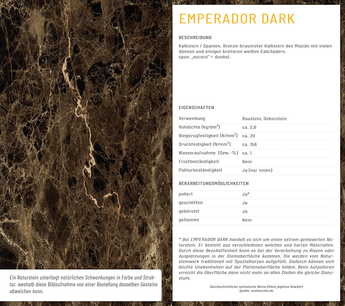 Bei den Sorten Rain Forest Brown, Rain Forest Green, Emperador Dark, Frappuccino und Daino handelt es sich um extrem gemaserte Natursteine. Diese bestehen aus verschiedenen weicheren und härteren Materialien. Durch diese Beschaffenheit kann es bei der Verarbeitung zu Rissen oder Ausplatzungen in der Steinoberfläche kommen, welche dann vom Natursteinwerk traditionell mit Spezialharzen aufgefüllt werden. Dadurch können sich leichte Unebenheiten auf der Plattenoberfläche bilden. Beim Aufpolieren erreicht dann die Oberfläche nicht mehr an allen Stellen die gleiche Glanzstufe.