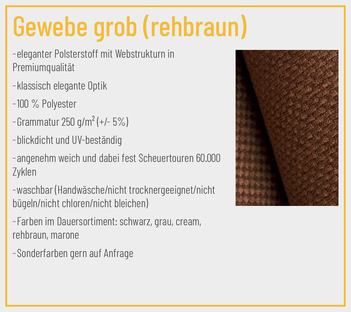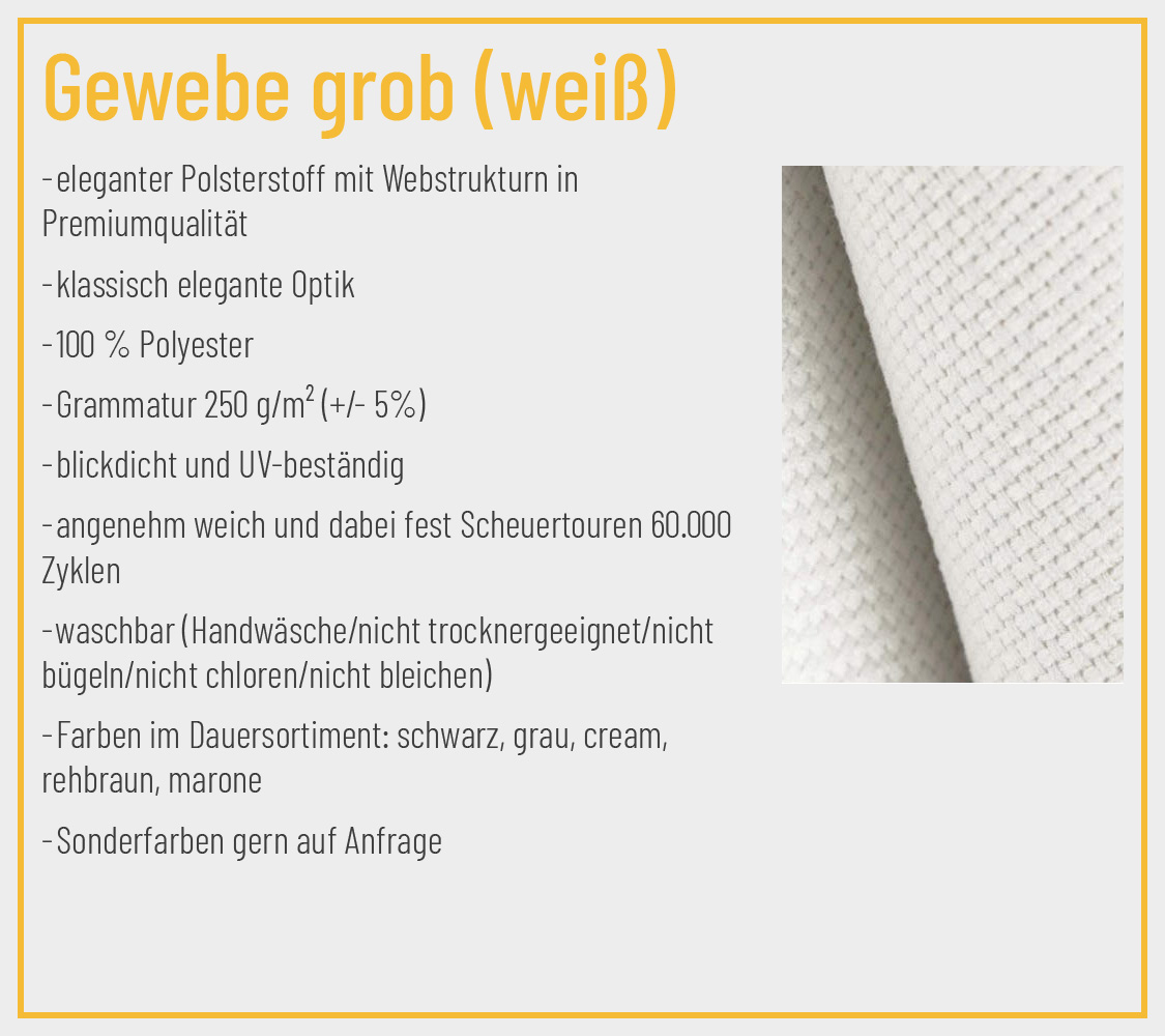 Ebenso sind Maßtoleranzen von bis zu 5 % üblich. Da es sich um handgefertigte Möbelstücke handelt, können sich im Polsterbereich diese Toleranzen durch unterschiedlichen Kraftaufwand bei der Fertigung und Spannung des Materials ergeben. Diese stellen keinen Reklamationsgrund dar und wirken sich auf Gebrauch, Nutzen und Funktion des Polstermöbelstücks nicht aus.